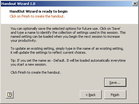 Before you proceed to create the handout, you can store the values and options you have set in the previous steps to re-use them later. Click on Save Settings and assign a name to the values that have to be stored. You can later load these value during another session by selecting it from the list of named settings available in Step 1