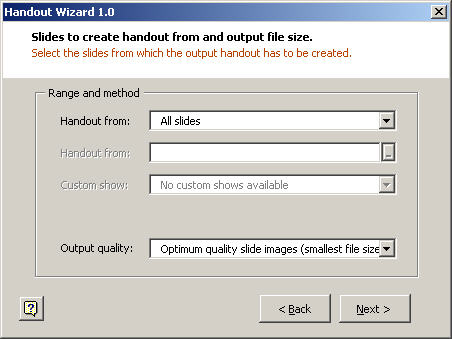 Output file options: This decides the quality of the slide thumbnail images. Medium and higher quality should only be used when you are not satisfied with the output or print output from the optimum quality setting.