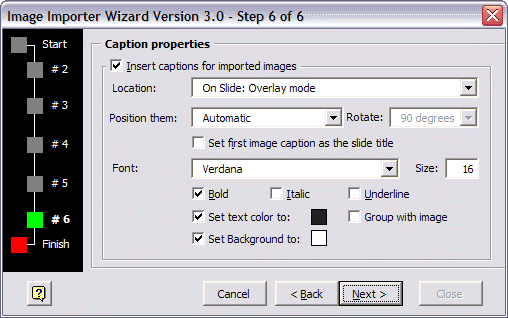 Set desired caption properties and you are ready to import the image. Click next to complete the import.