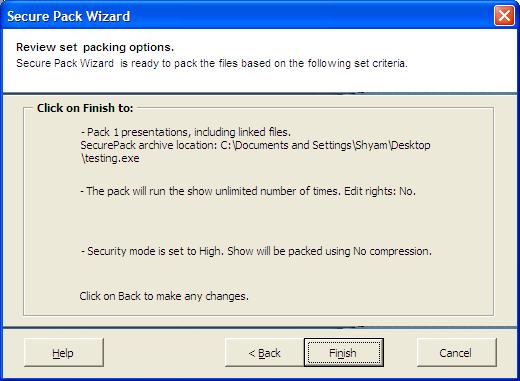 | Secure Pack Wizard Tour Now that you have made all the necessary choices, all that is left to do is to click on FINISH to complete the task. Once packed, the Secure Pack Show can be distributed to any user.